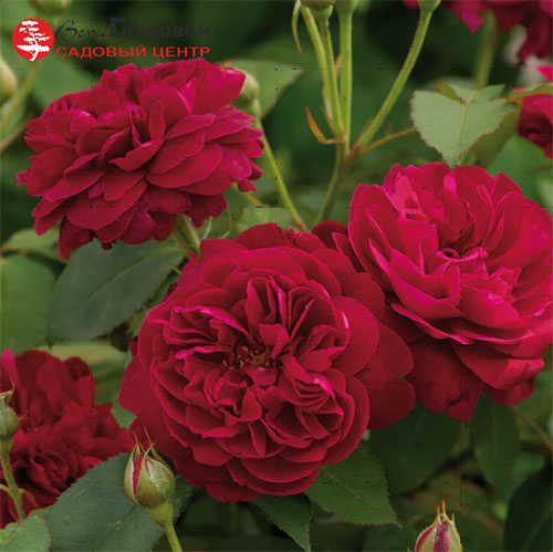 Куст высотой до 100 см, очень красивый и пышный. Цветки густомахровые, диаметром 10-12 см, количество лепестков 60-80 шт. Потрясающий красивый красно-малиновый цвет, приобретает легкий фиолетовый отлив перед опаданием лепестков. На одном стебле образуется соцветие из 3-5 цветов. Приятный, еле уловимый фруктовый аромат, с нотками зелени.